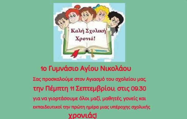 Ο αγιασμός στο 1ο Γυμνάσιο Αγίου Νικολάου θα πραγματοποιηθεί την Πέμπτη 11 Σεπτεμβρίου στις 09:30, με τη συμμετοχή μαθητών, γονέων…